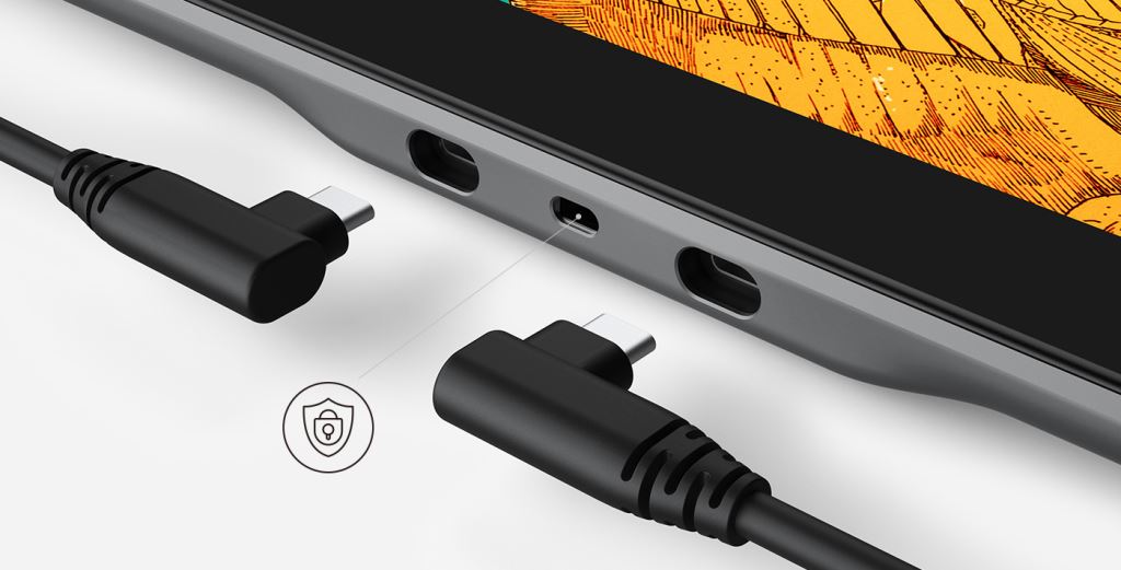 A Tablet Artist Pro 16TP két teljes USB-C porttal rendelkezik, amelyek támogatják az USB-C – USB-C kapcsolatot, így tiszta asztalt és több csatlakozási lehetőséget kínál. Az oldalán található további biztonsági nyílás lehetővé teszi a táblagép lopás elleni védelmét.
