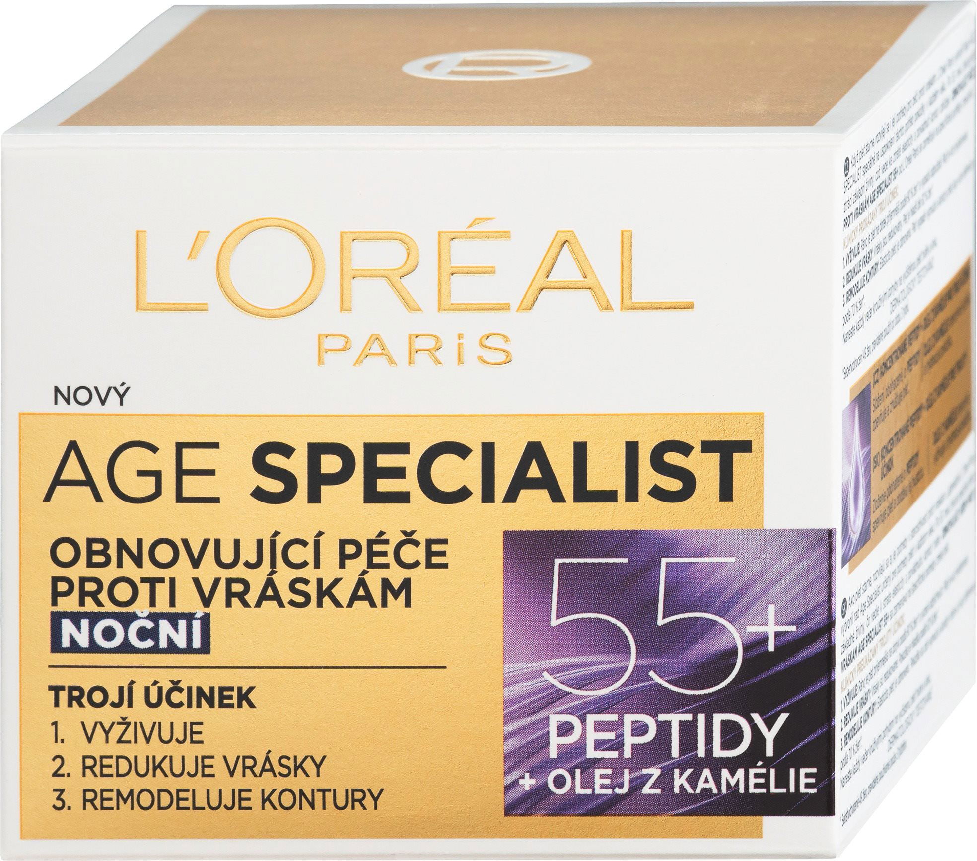 A L"ORÉAL Age Specialist Night 55+ egyike az Age Specialist termékcsaládnak, amelyet elsősorban az 55 év feletti nőknek készítettek. A bőrsejtek regenerációja 55 év felett lelassul, így a bőr kevesebb tápanyaghoz jut, mélyebb ráncok keletkeznek és a bőr lassú öregedése megkezdődik. AL"Oréal fejlesztői kombinálták az öregedést gátló hatóanyagokat egy olajkoncentrátummal ésFloroglucinnal, hogy így lassítsák le az öregedés jeleit. Az olajnak köszönhetően csökken a pigmentáció, valamint segít átalakítani a bőr kontúrjait. AFloroglucin pedig intenzíven táplálja a bőrt, és csökkenti a mély ráncokat.