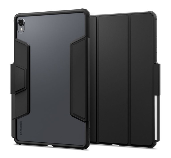 Spigen ULTRA HYBRID PRO tok álló, bőr hatású (FLIP, oldalra nyíló, TRIFOLD, asztali tartó, ceruza tartó) FEKETE Samsung Galaxy Tab S11 5G (SM-X736B) /