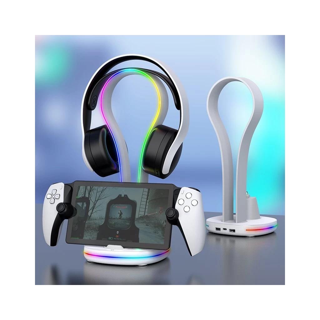 iPega P5P23 töltőállvány RGB, Playstation Portal Remote Player készülékhez, állványos fejhallgató, fehér